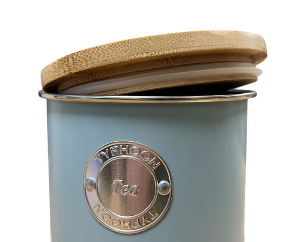 Zeer fraaie Typhoon metalen thee bewaarbus. De deksel is van bamboe met een silicone afdichtring om uw thee optimaal te bewaren.