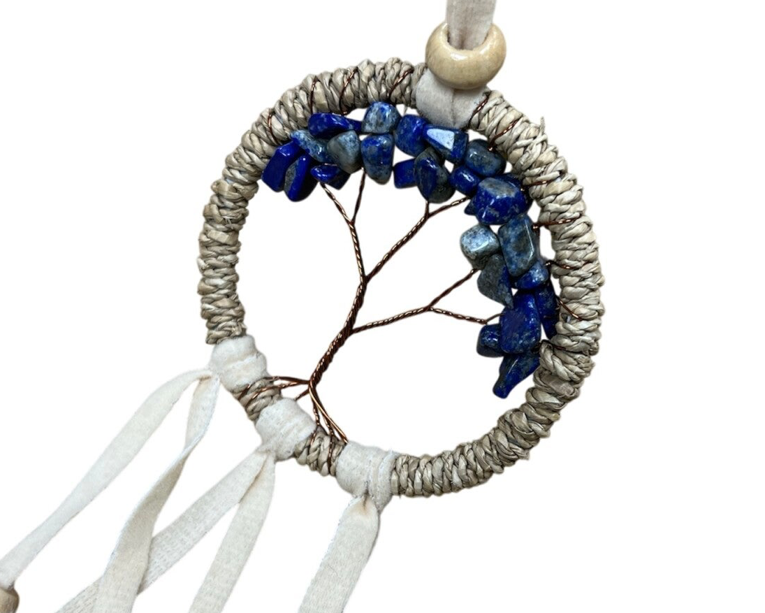 Deze kleine dromenvangers zijn uitgevoerd met echte sodaliet steentjes en veren.