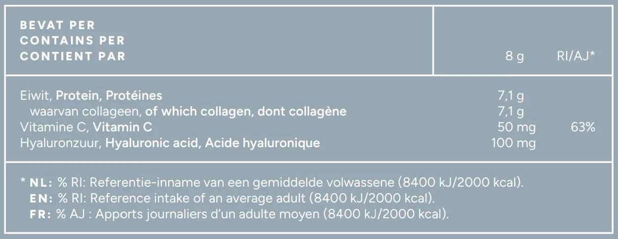 Collageen is rijk is aan eiwitten, welke bijdragen aan de instandhouding van sterke botten en de instandhouding en groei van de spiermassa. Aan deze blend zijn vitamine C en Hyaluronzuur toegevoegd. Vitamine C draagt bij tot de normale collageenvorming voor de normale werking van de botten en het kraakbeen.