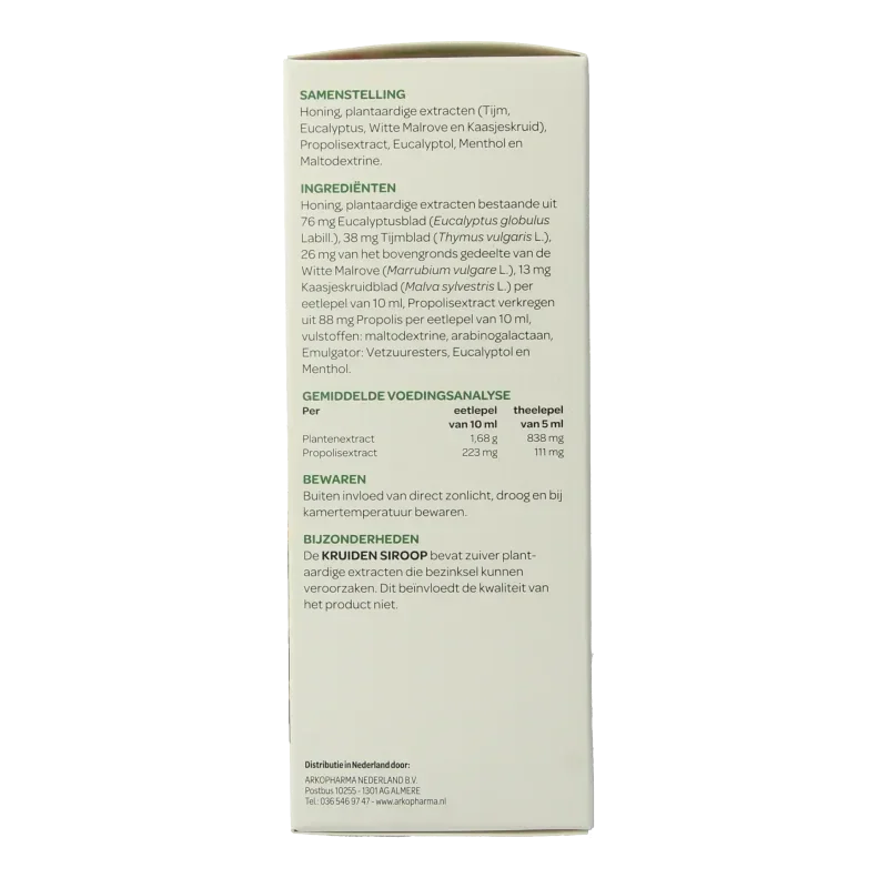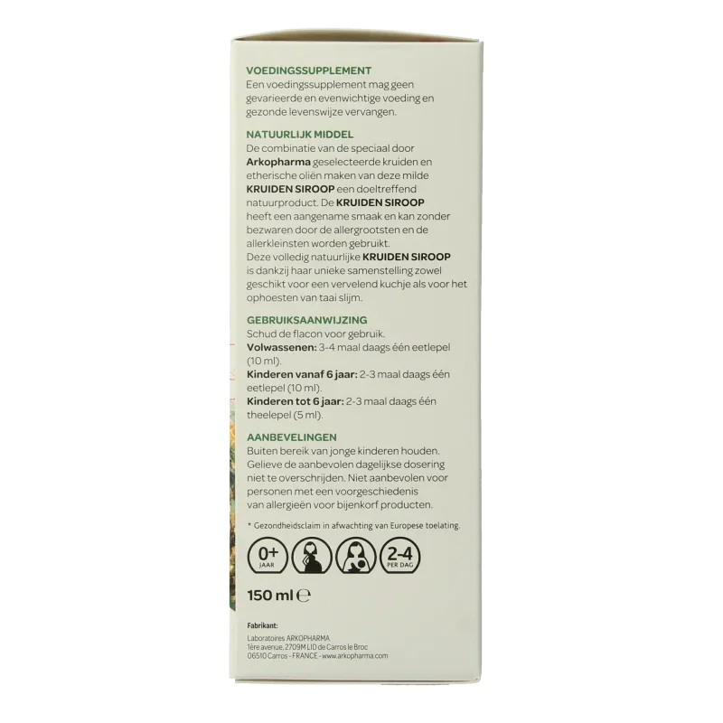 De combinatie van de speciaal door Arkopharma geselecteerde kruiden en etherische oliën maken van deze milde KRUIDEN SIROOP een doeltreffend natuurproduct. De KRUIDEN SIROOP heeft een aangename smaak en kan zonder bezwaren door de allergrootsten en de allerkleinsten worden gebruikt.
